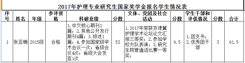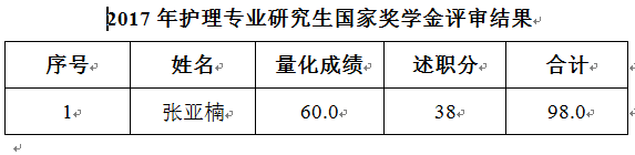 根据承德医学院研究生院下发《承德医学院研究生国家奖学金评审办法》和《承德医学院护理专业研究生国家奖学金评审办法》,经护理学院国家奖学金评审委员会评审,现将护理学院国家奖学金获奖学生情况进行公示: