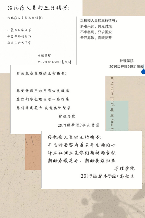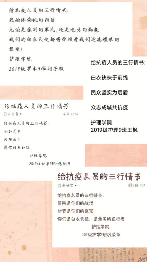 1月15日,团支部开展“感同身受,互助前行”主题线上活动。团支部成员在钉钉召开视频会议,视频中相互交流居家隔离期间感受,参加志愿者活动的同学也积极分享抗疫感想。会议上团支部了解到同学们都严格服从学校、社区、村委会等相关组织的管理,严格落实居家隔离,配合进行核酸检测。作为医学生成员们也牢记医学生的使命和责任,跟随前辈们的脚步,积极参与当地志愿组织,为抗疫献出一份力量。团支部同学用“三行情书”表达对白衣战士的敬佩与歌颂。截至1月16日共收到30余篇作品,每份作品都饱含着同学们对白衣天使的关心。